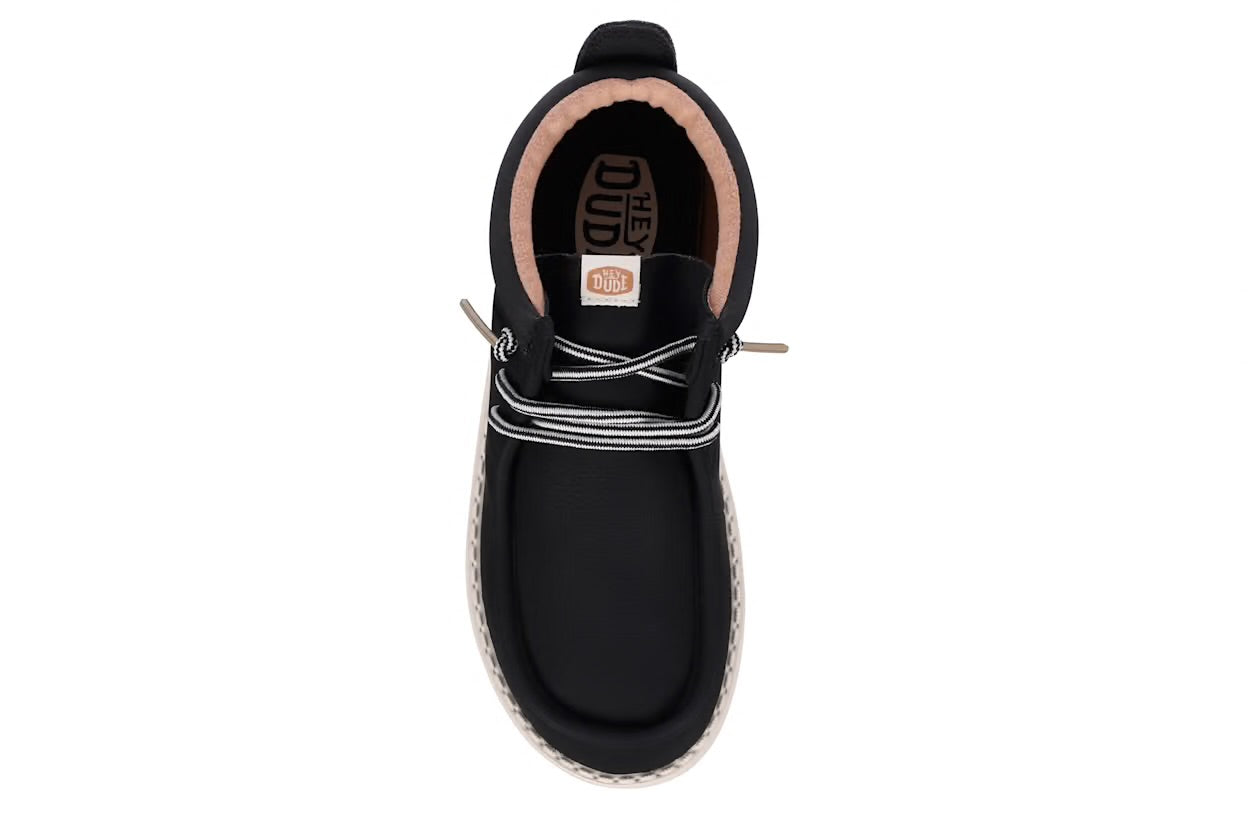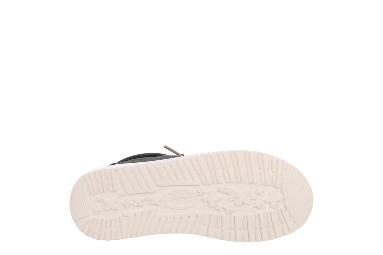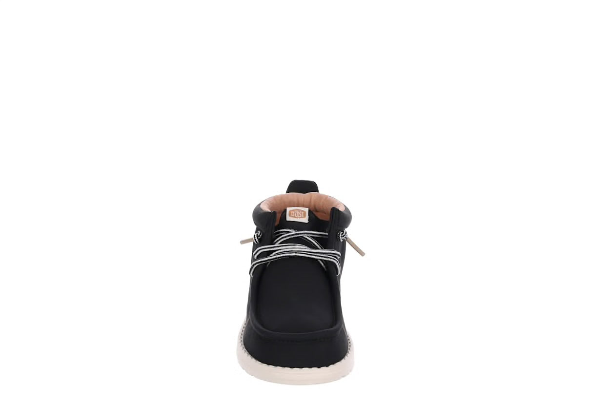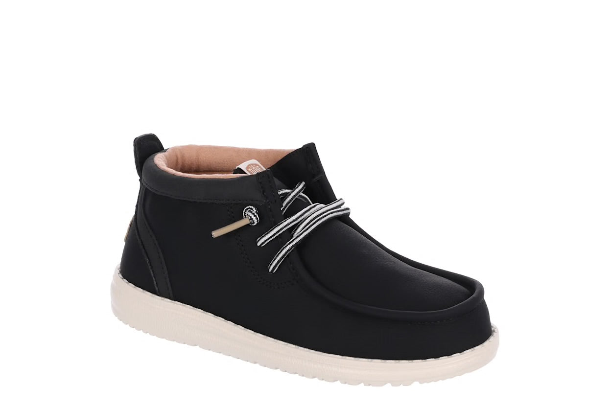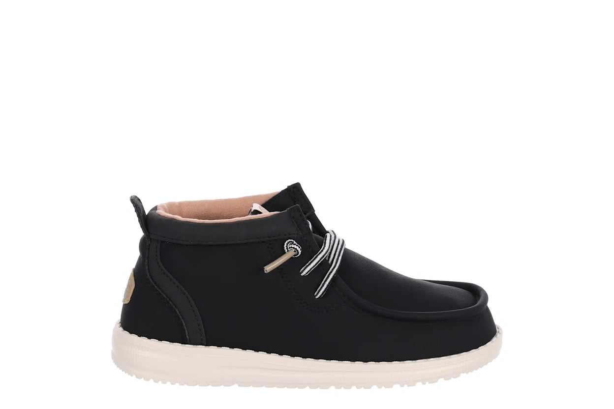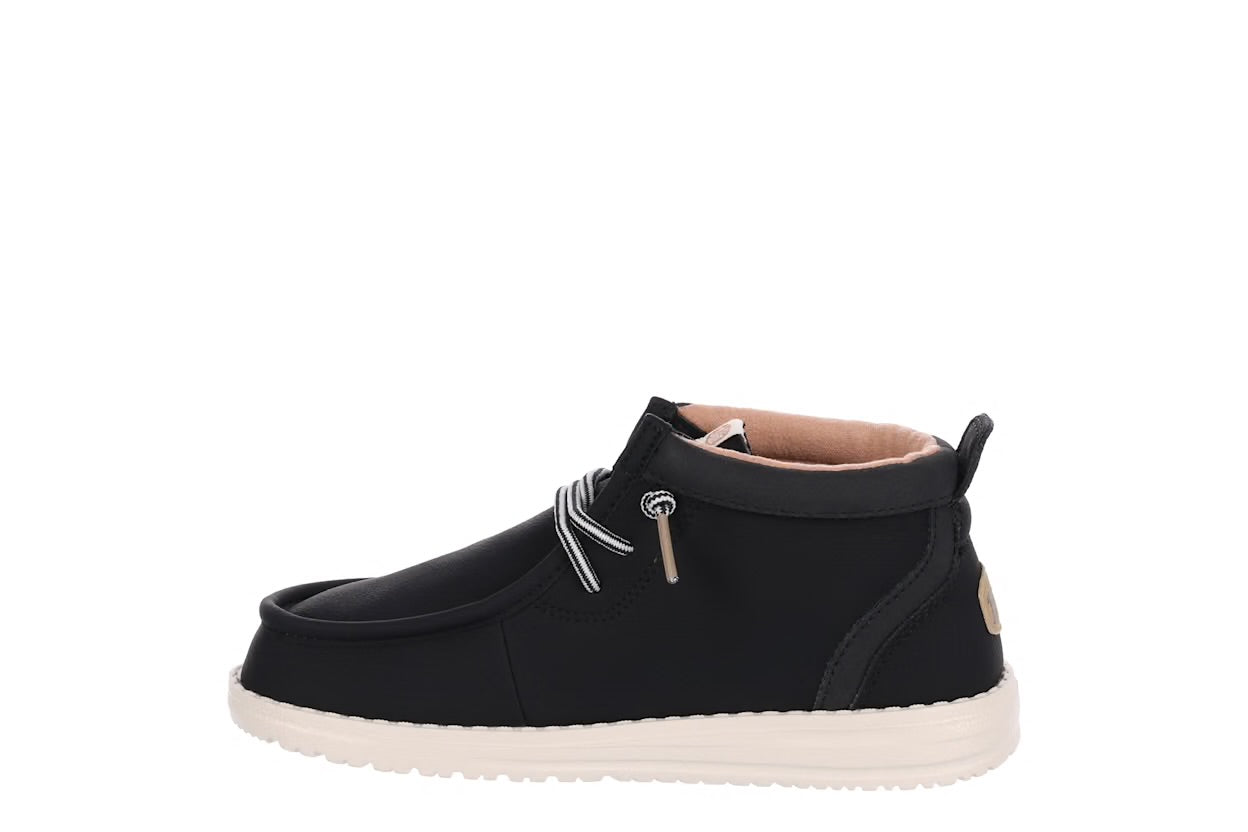 Winter-friendly HEYDUDE comfort lives on with the Wally Youth Mid boys' chukka boot. Featuring a waxed canvas upper treated with water repellent spray and an easy-on system, this shoe is made for travel. The removable insole makes movement easy, while the lightweight outsole provides flexible traction.
